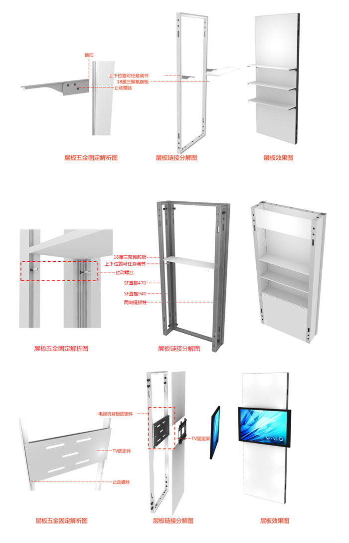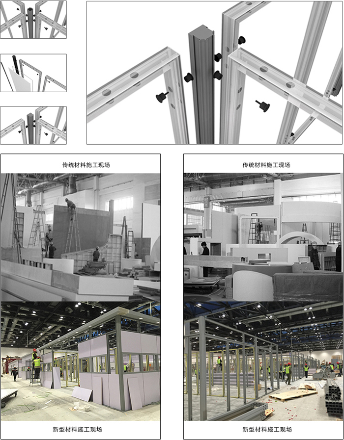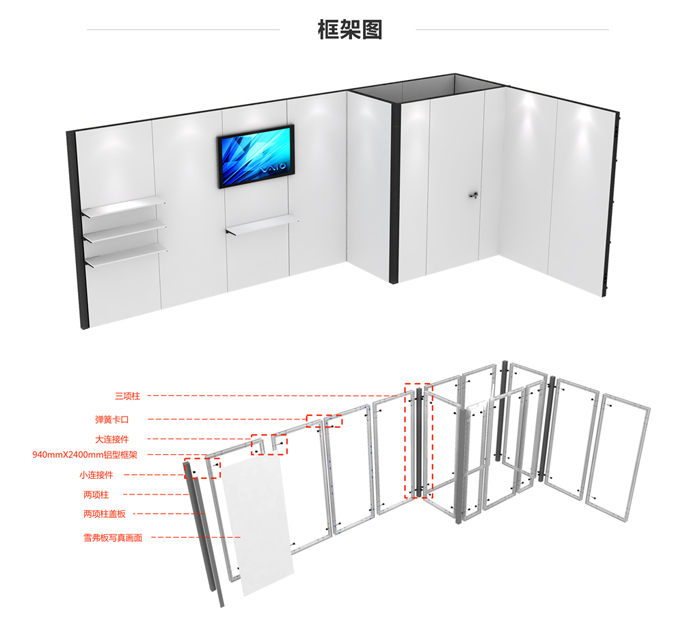 走線纜,框體之間由螺絲鏈接而成,框體外部可粘貼雪芙板畫面、木結構板材及噴繪布及燈箱,可以組合層板、AV設備及其他沖