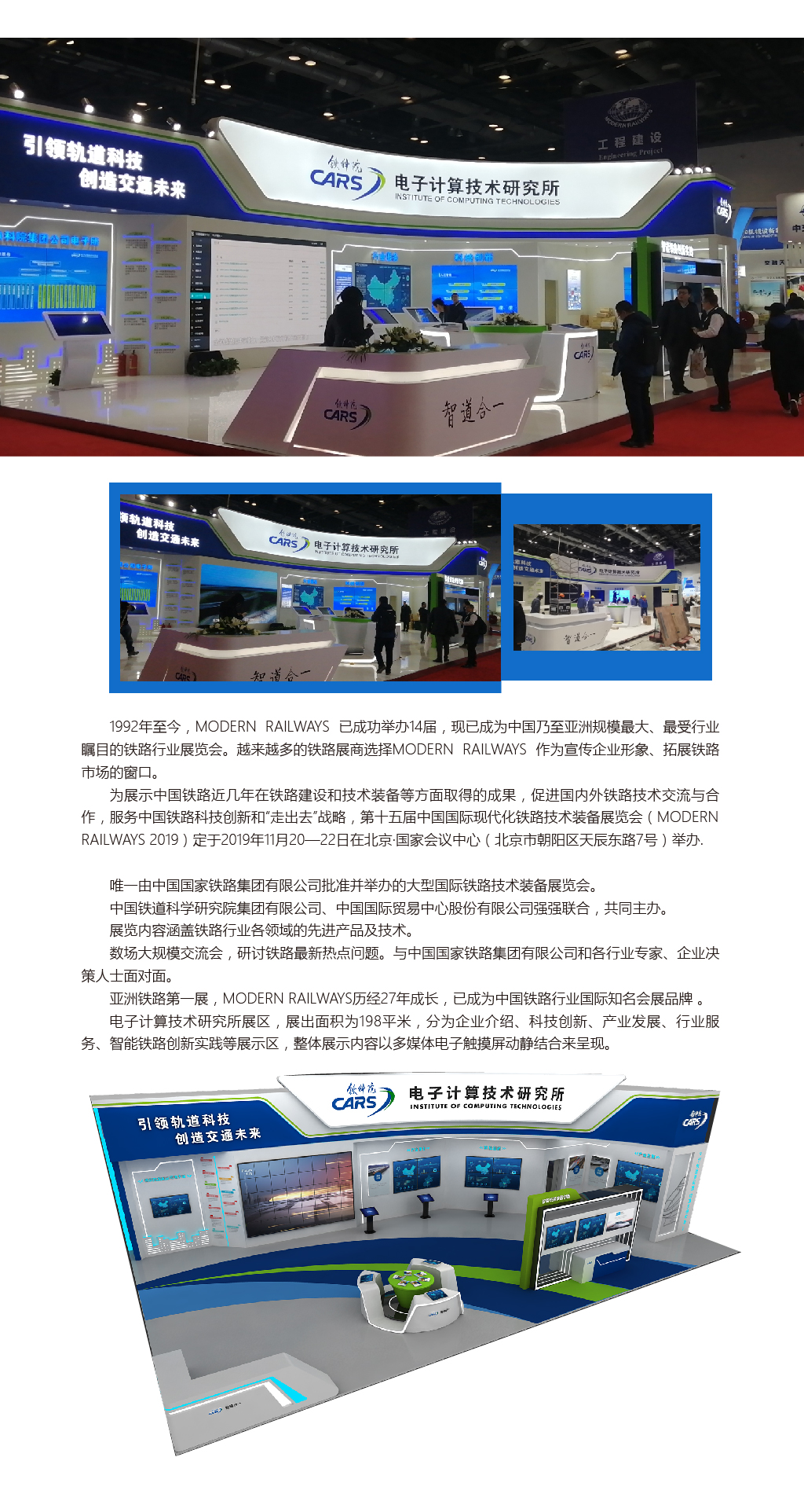 電子計算技術(shù)研究所展區(qū),展出面積為198平米,分為企業(yè)介紹、科技創(chuàng)新、產(chǎn)業(yè)發(fā)展、行業(yè)服務、智能鐵路創(chuàng)新實踐等展示區(qū),整體展示內(nèi)容以多媒體電子觸摸屏動靜結(jié)合來呈現(xiàn)。